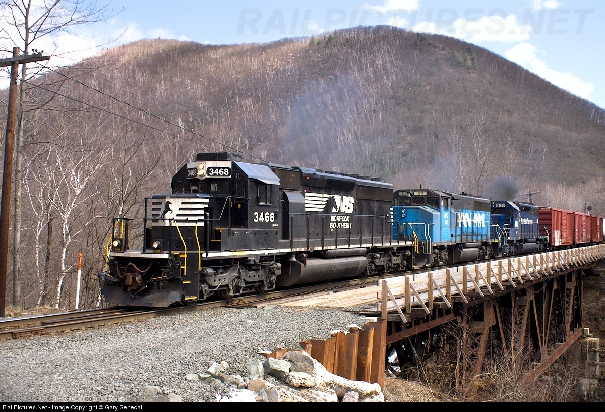 Westbound Pan Am Southern train EDMO crosses the Deerfield River, about to enter the Hoosac Tunnel. Trailing the NS leader is the last Pan Am "phase 1" painted unit. All three of these units smoked up a storm on the upgrade journey from East Deerfield MA.
