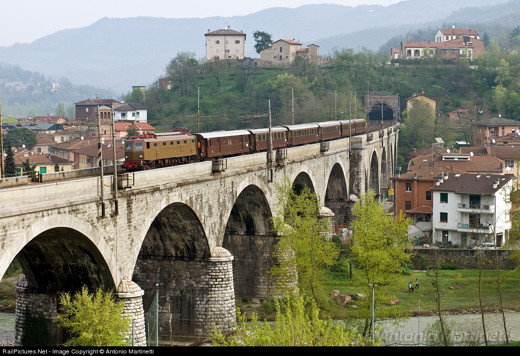 | An historic train organized on the 80th anniversary of "Direttissima" Bologna-Firenze line, across the Appennines. E 428 202 is seen on the viaduct dominating Monzuno village, on the northern ramp towards the 18 km summit tunnel. |