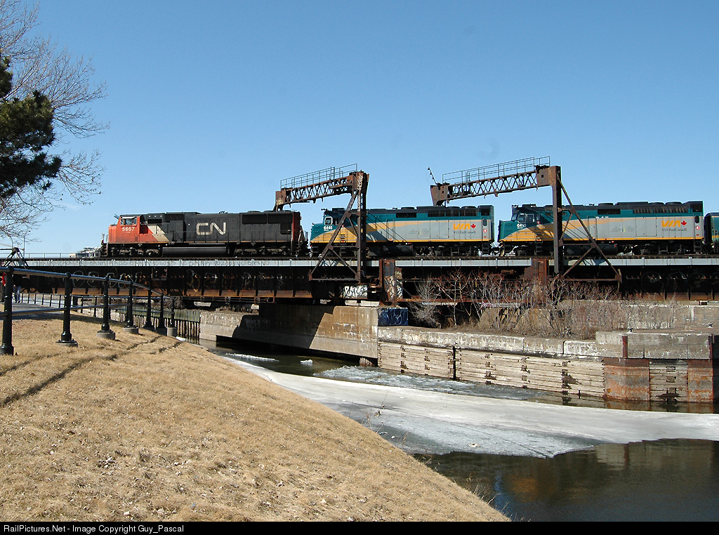 VIA 15 getting over Bassin Peel in Montreal,but this time is exeptionnal,after improving trouble with the locomotives,VIA Rail requested a CN locomotive to rescue the VIA 15 to Montreal.Not everyday we can see a CN SD75I backing up into Montreal Central station
