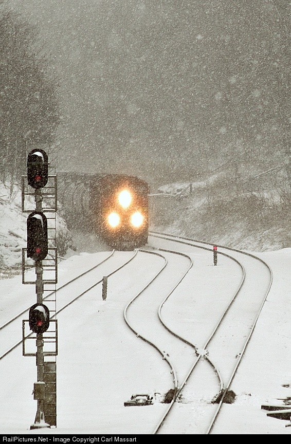| An empty CSX oil train with BNSF run-through power is about to crest the summit as it heads west for a re-load. March is really going out like a lion as evidenced by the near white out conditions at the summit. I can't wait to get back in the car and head to the Maple Festival in town to get some real maple syrup! |