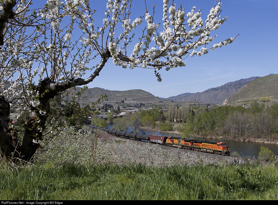 | An empty oil train rolls around the curve along the Wenatchee River just east of Monitor, WA as the apple blossoms reach their prime. The lead unit is nearly PR imagery, but the trailing Dash 9 has seen better days with its burnt hood and former ATSF air conditioner. Maybe the perfect consist will show up tomorrow! |