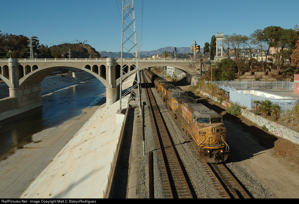 | The crew of the Coast Oil Cans slowly eases their train under the North Broadway St Bridge and along the Los Angeles River towards for the last hundred or so yards of their run. At Main St. crossing they will be replaced by a Los Angeles Basin crew who will take the Cans to Dolores Yard, but for now they have about a half hour to wait before the replacement crew arrives. |