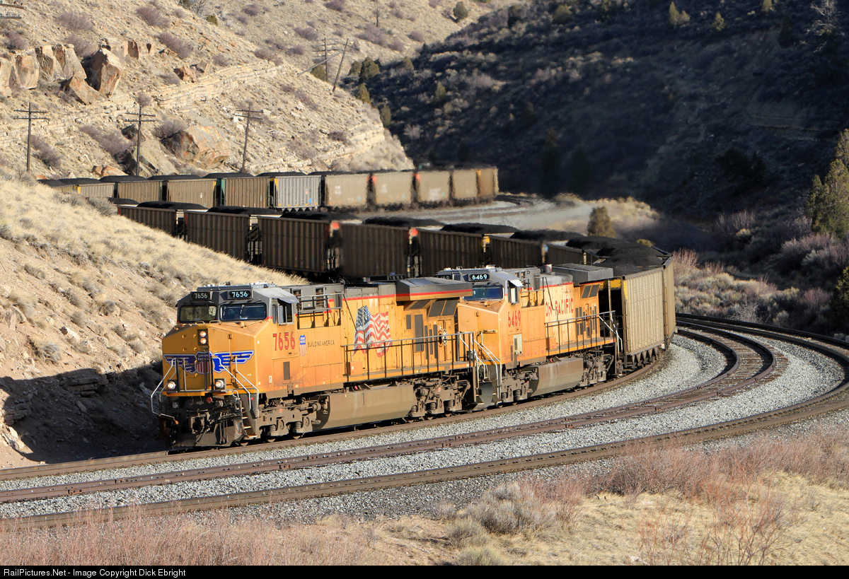 | This one of my favorite photo locations on the east side of the Soldier Summit grade. The location is called Kyune and it is nearly at the top of the almost 2.4% grade up from Helper. This is strictly an afternoon/evening spot for favorable light. The UP 7656 and its other head end power as well as the 3 unseen manned swing helpers and the 2 rear end DPU's are going through these beautiful reverse curves with their 14,586 ton train of eastern Utah coal. Then it's just one more curve before the grade lessens. |