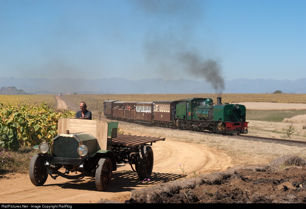 Sandstone Estates' recently restored Peerless road truck (Built 1915?) gives a light coating of dust to passing NGG16 No. 88 near Hoekfontein station. This photo was taken on the first day of Sandstone's "Stars of Sandstone 2014" steam festival that continues to 21st April 2014