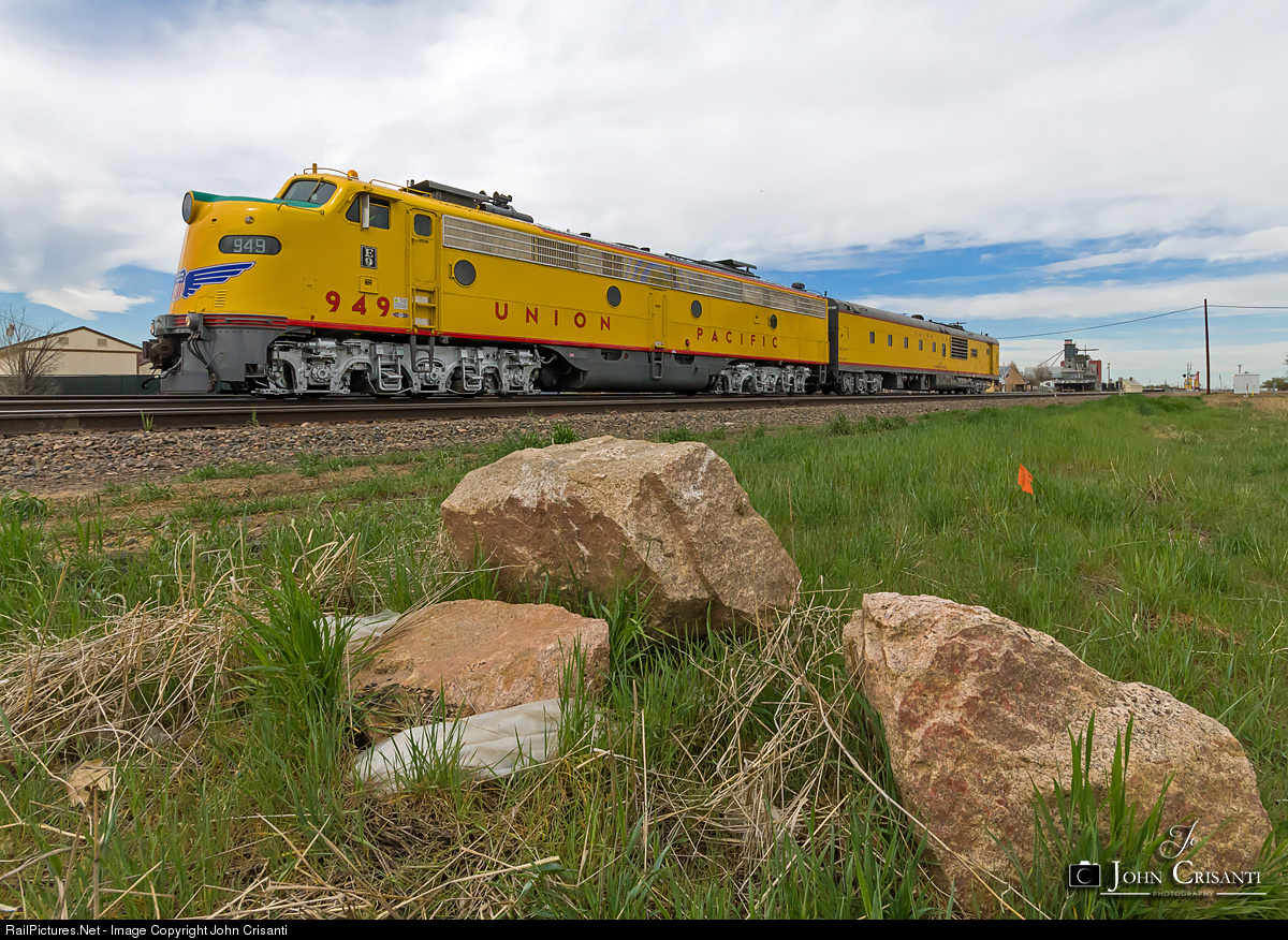 Normally stored at the UP Steam Shop and Roundhouse in Cheyenne, Wyoming, UP 949, one of three E9's left on the UP roster lead a test train down the Greeley Sub in Brighton, Colorado. They will hold the main here for a northbound manifest. The car behind 949 is the "Howard Fogg".