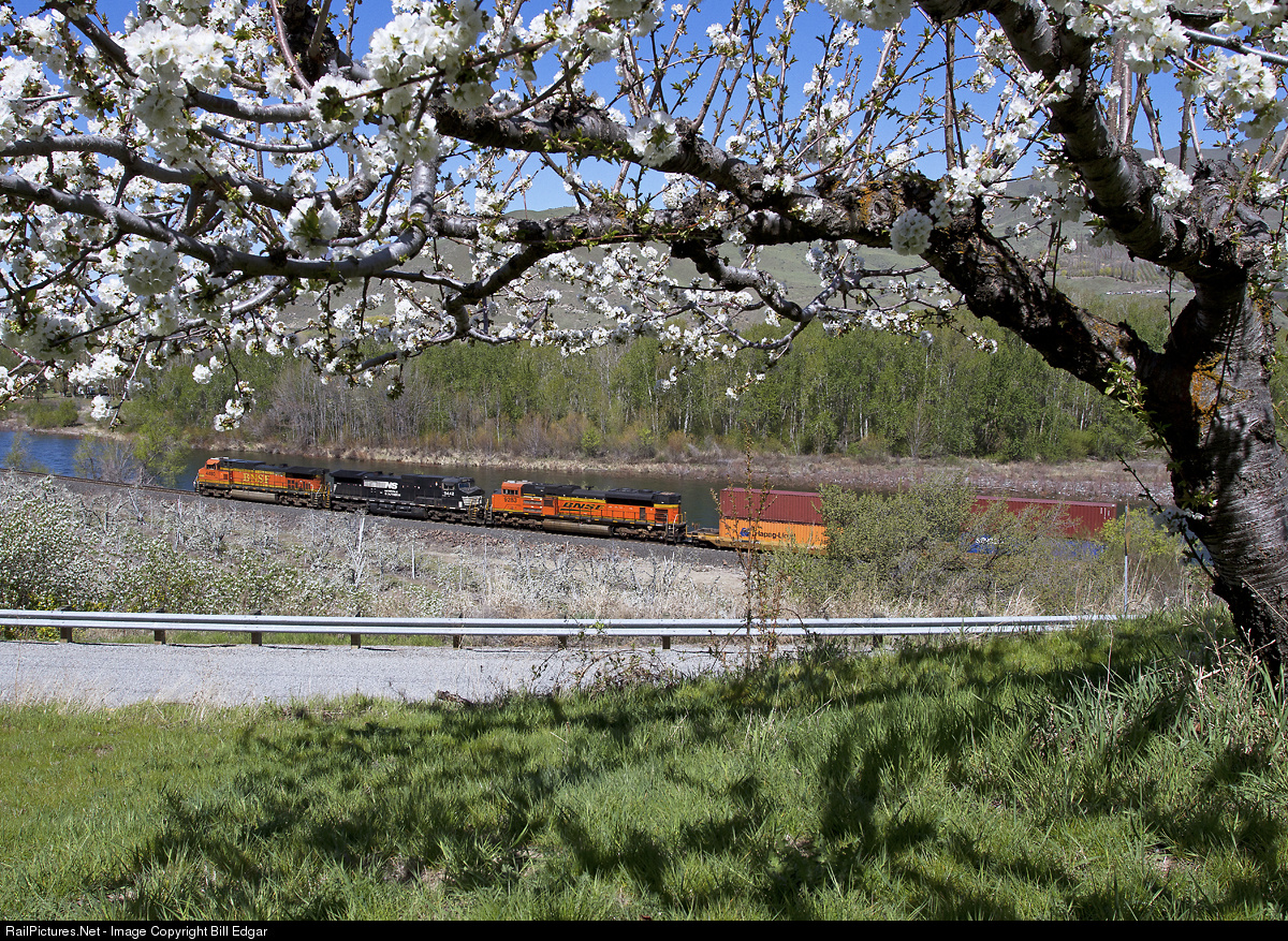 BNSF 4460 leads a westbound stack train out of Wenatchee through the orchards along the Wenatchee River with apple blossoms in full bloom.