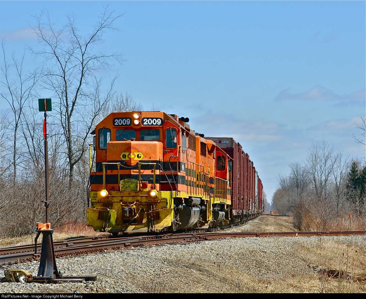 | The Quebec Gatineau train for Thurso heads west past the wye for Lachute. It has a pair of geeps (QGRY 2009 and 2502) and 14 cars. Thanks to Ken Goslett for driving and choosing the spots, as this is my first time shooting this scenic line. For more train photos, click here. |