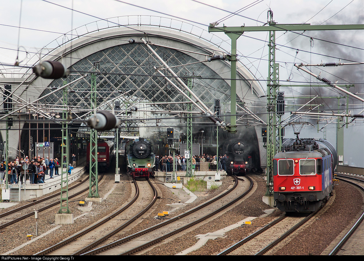 Representing Switzerland far away from home rails is Re 421 397 with a tank car train from the Czech border rolling through Dresden main station, where two steam trains with locomotives 18201 and 52 8079 are ready for departure for a parallel run over the Tharandt ascent, on the occasion of the Dresden steamlocomotive meeting 2014. The Re 421 397 is not running for SBB Cargo, but rented to HSL Logistik, a german freight operator from Hamburg.