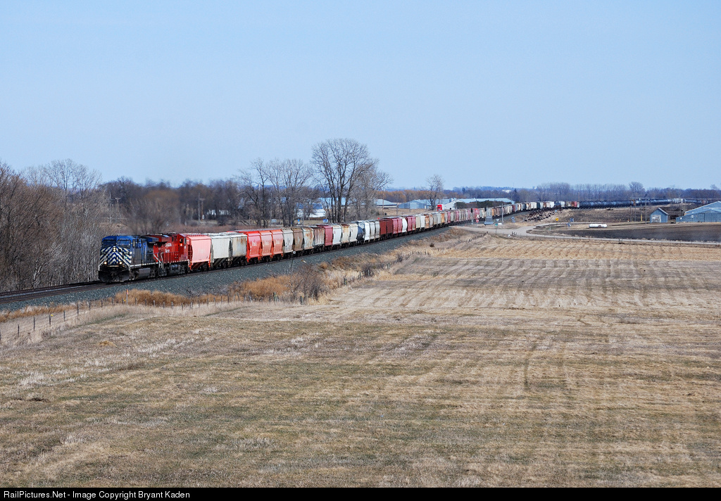 | Coming in at 10,337' on the MP 93.6 detector, this is close to the longest train I've seen on the Paynesville Sub. You can see nearly the entire thing as it passes over the switch at Murray West and approaches the Highway 71/55 overpass on the east side of Belgrade. |