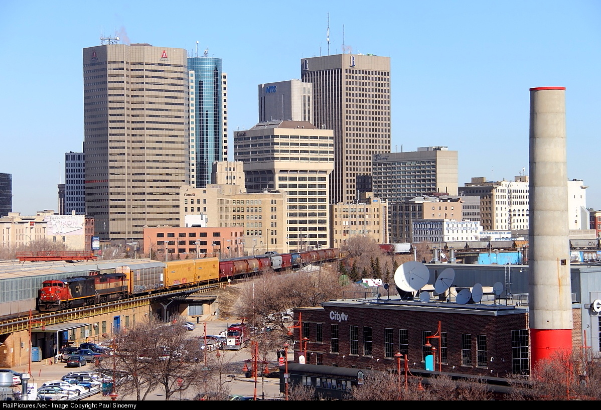 A pair of GE cowl units lead a westbound manifest through downtown Winnipeg.