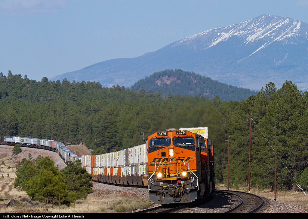 | BNSF 7376 leads the Z WSPSBD9 16L west through the sag at East Williams, with the San Francisco Peaks dominating the background. |