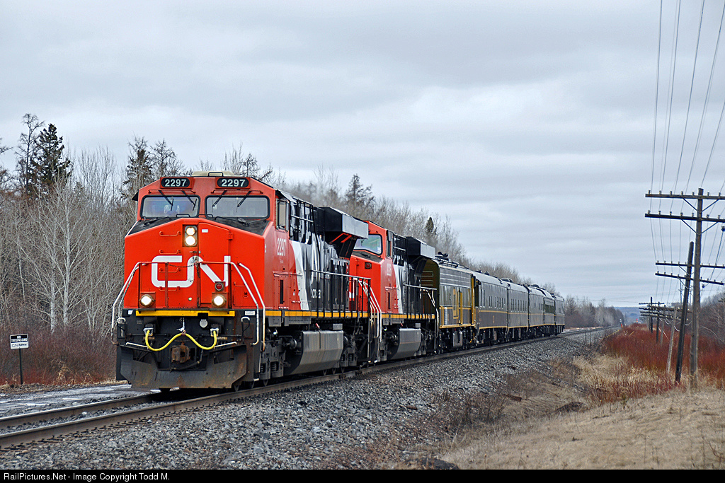 | It's a cold and gloomy day but CN really did up a nice looking CN business train. Filled with CN brass, the train rolls off the DWP Jct. connecting track and heads down the CN Missabe Sub after leaving Rainer, MN earlier in the morning. The train operated from Winnipeg to Superior. |