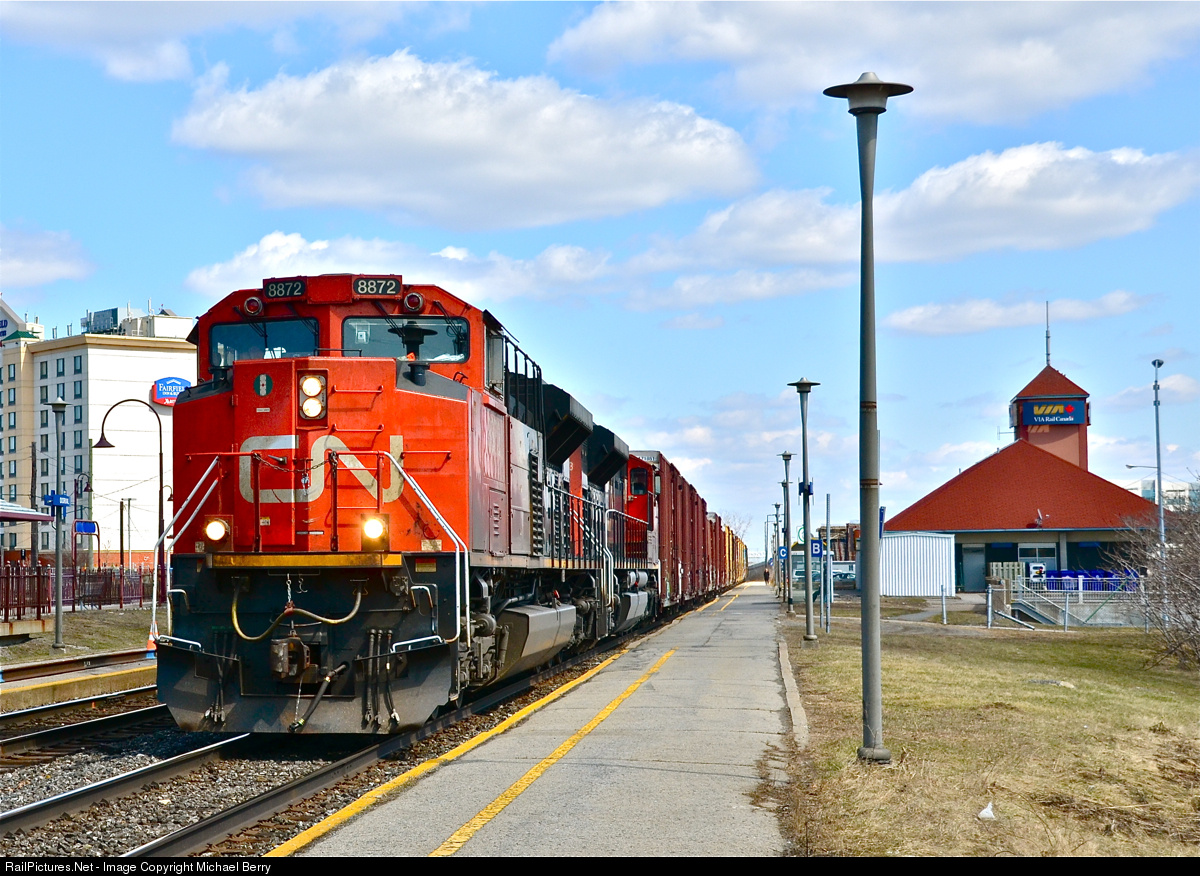 | A pair of SD70M-2's (CN 8872 & CN 8903) head west through Dorval with CN 377. A minute later its counterpart (CN 376) will pass by on the north track. For more train photos, click here. |