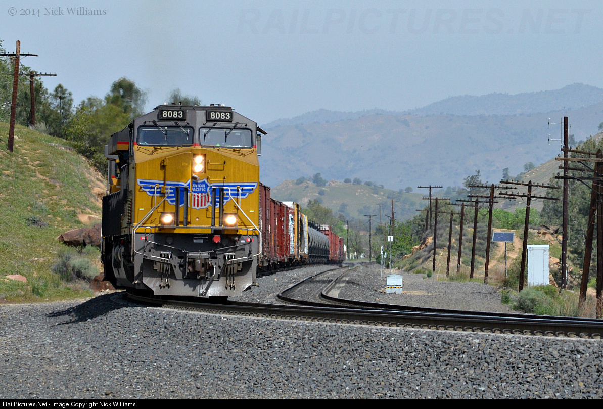 | UP 8083 and her two engines behind help pull this heavy West Colton, CA bound manifest up the apparent grade at Woodford, CA. The engines are screaming giving it all they've got making a whopping 11MPH. |