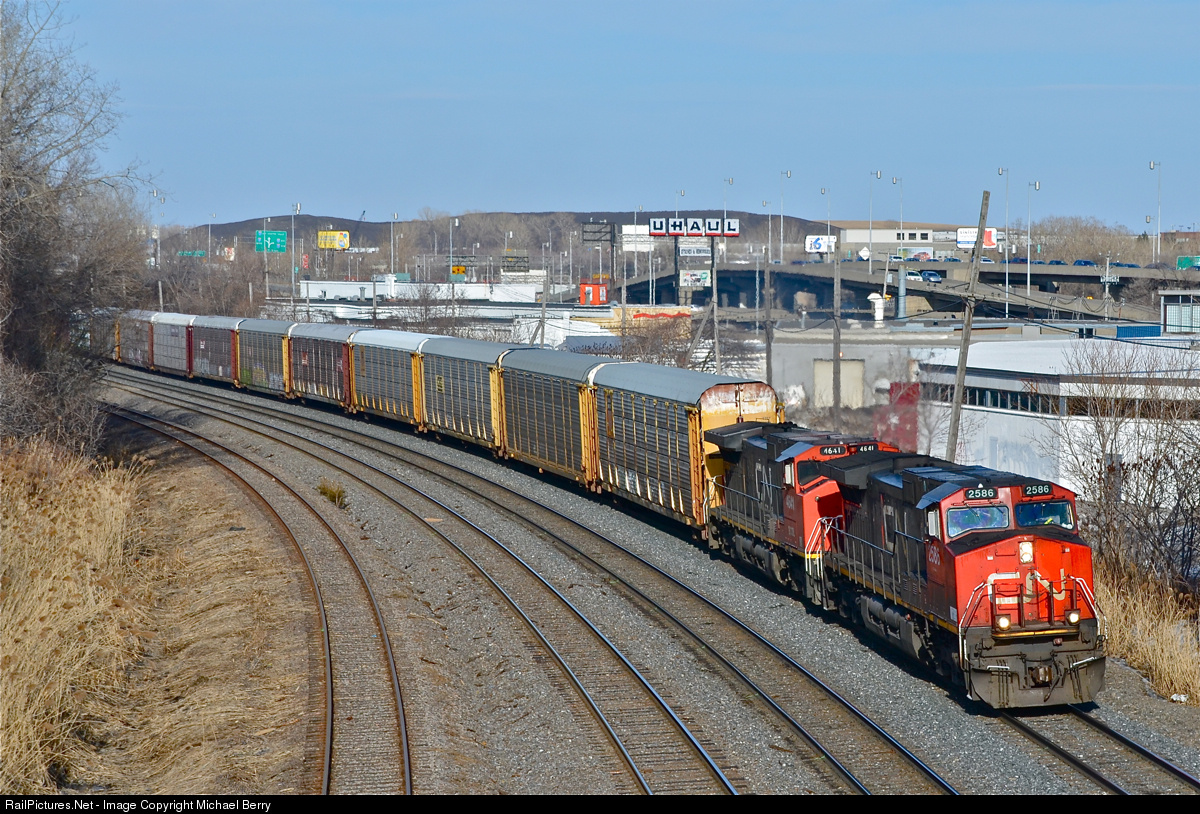 CN 2586 & BCOL 4641 in CN paint head west through Montreal West with CN 401, which always has autoracks at the headend. For more train photos, click
