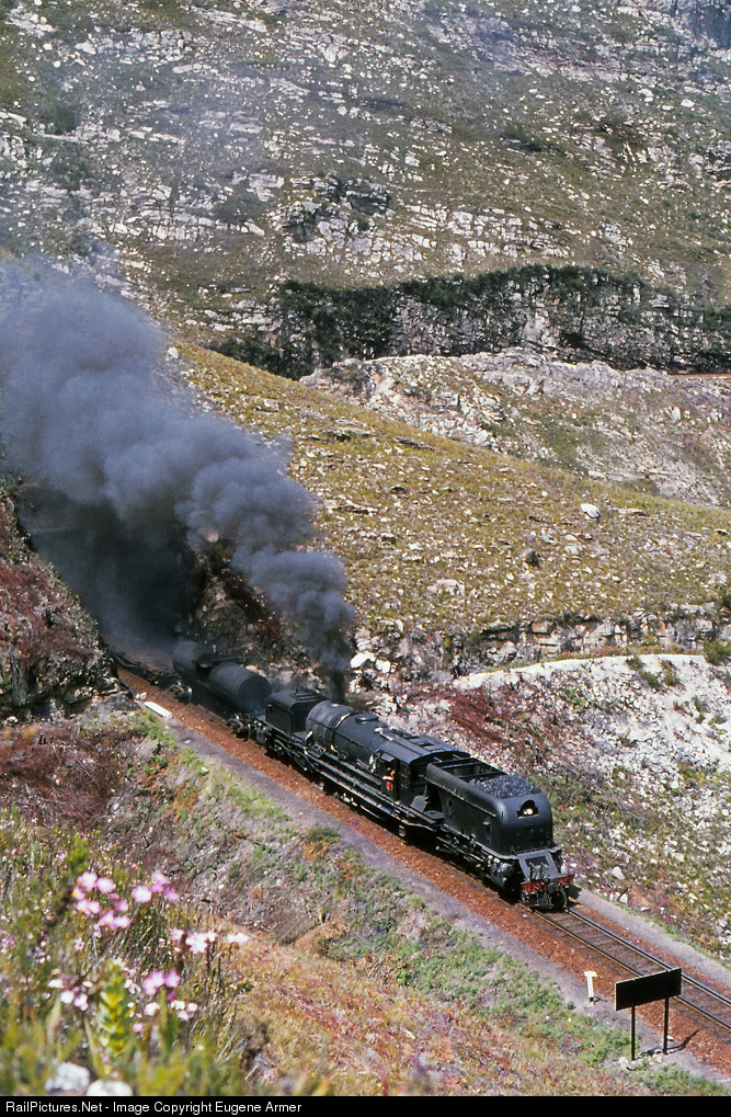A class GMAM garratt bursts out of tunnel no.6 with a freight train as it approaches the summit of the Montague Pass between George and Oudtshoorn. Since leaving the town of George, the train has climbed 489 meters (1604 feet) in a distance of 25 km (15 miles).