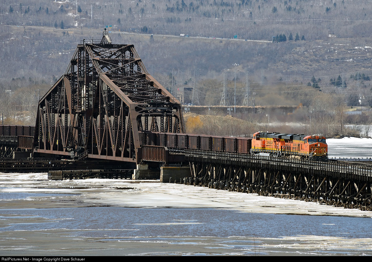 | A rare move of a BNSF ore train interchanged off the CN in Duluth moves across Grassy Point Draw and a partially frozen St. Louis River. Train was loaded at U.S. Steel's Minntac plant and will unload at Granite City (Madison), Illinois. |