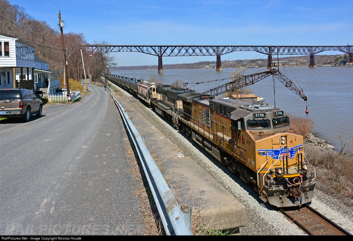 Leading a southbound, UP 5796 rolls under the Poughkeepsie Bridge. Sometimes known as the Poughkeepsie Railroad Bridge, the bridge is a steel cantilever bridge spanning the Hudson River between Poughkeepsie, New York on the east bank and Highland, New York on the west bank. Built as a double track railroad bridge, it was completed on January 1, 1889, and went out of service on May 8, 1974. It was listed on the National Register of Historic Places in 1979, updated in 2008. It was opened to the public on October 3, 2009, as a pedestrian and cyclist bridge and New York State Park.