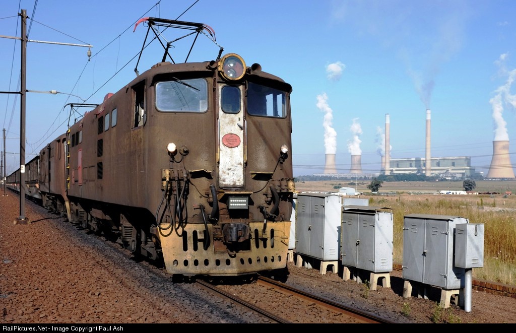 | Africa's oldest working electric locomotives still put in a hard day's work hauling coal from BHP Billiton's Middelburg coal mine to fire the huge boilers at the Duvha power station which can be seen behind the train. The train is returning to the mine with empty side-dump hoppers. The fleet of 10 ex-SAR locos were built between 1959 and 1964. The lead loco is actually red under all the grime. |
