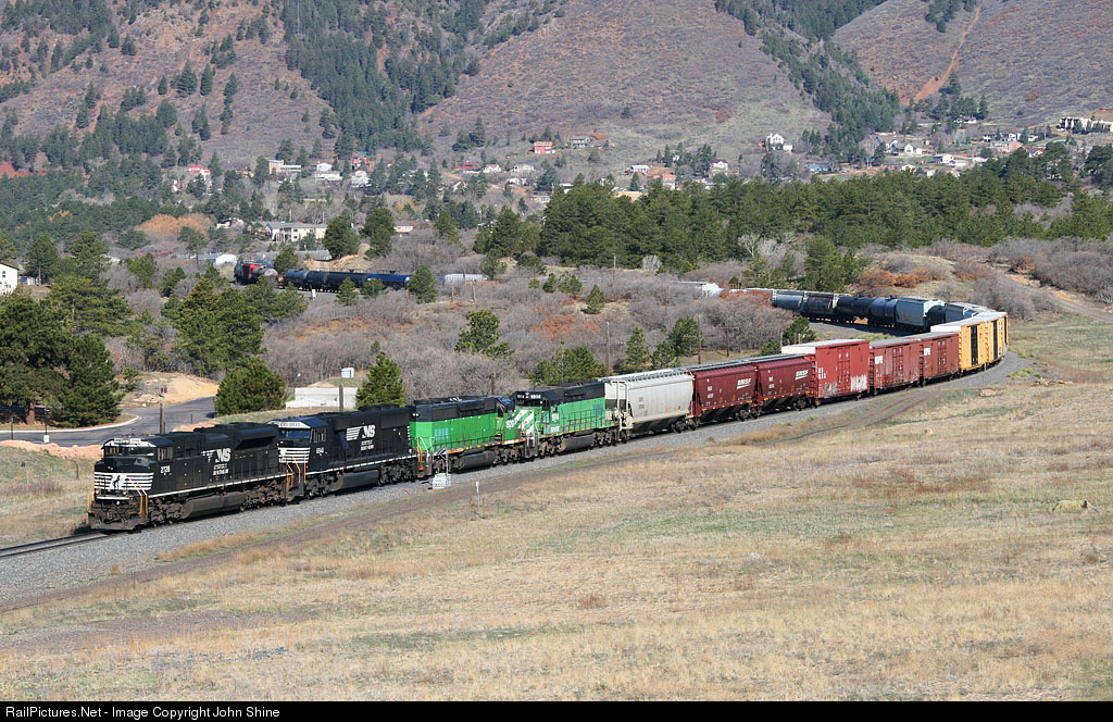 BNSF's Denver to Kansas City train drops downgrade from Palmer Lake with this nice consist of a pair of NS engines and two BNSF SD40-2's in Cascade Green!