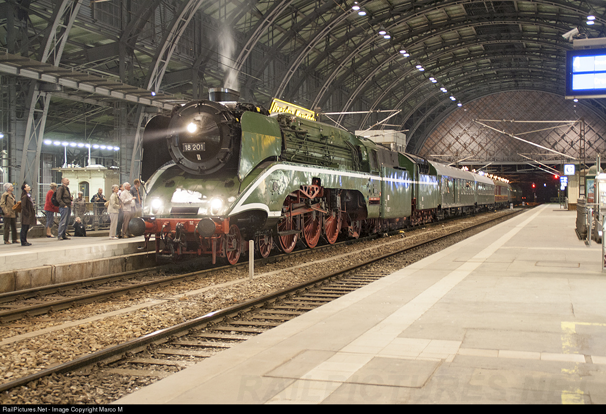 | Returning from a special to Wrocław in Poland, 18 201 makes a stop at Dresden-Neustadt station. The second tender is an additional water and oil supply for long runs. |