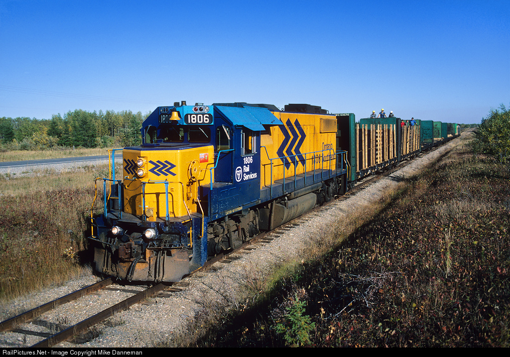 Workers ride the flatcars distributing ties along the right-of-way on a westbound Ontario Northland work train at milepost 87 east of Opasatika, Ontario, on September 21, 1993. This is a portion of the old Canadian Northern main line between Calstock and Cochrane that ONR bought and began operating in 1993 after Canadian National put the line up for abandonment.