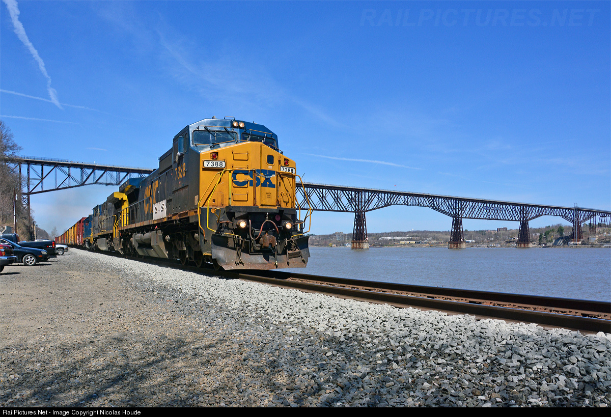 Leading a southbound, CSXT 7388 rolls under the Poughkeepsie Bridge. Sometimes known as the Poughkeepsie Railroad Bridge, the bridge is a steel cantilever bridge spanning the Hudson River between Poughkeepsie, New York on the east bank and Highland, New York on the west bank. Built as a double track railroad bridge, it was completed on January 1, 1889, and went out of service on May 8, 1974. It was listed on the National Register of Historic Places in 1979, updated in 2008. It was opened to the public on October 3, 2009, as a pedestrian and cyclist bridge and New York State Park.