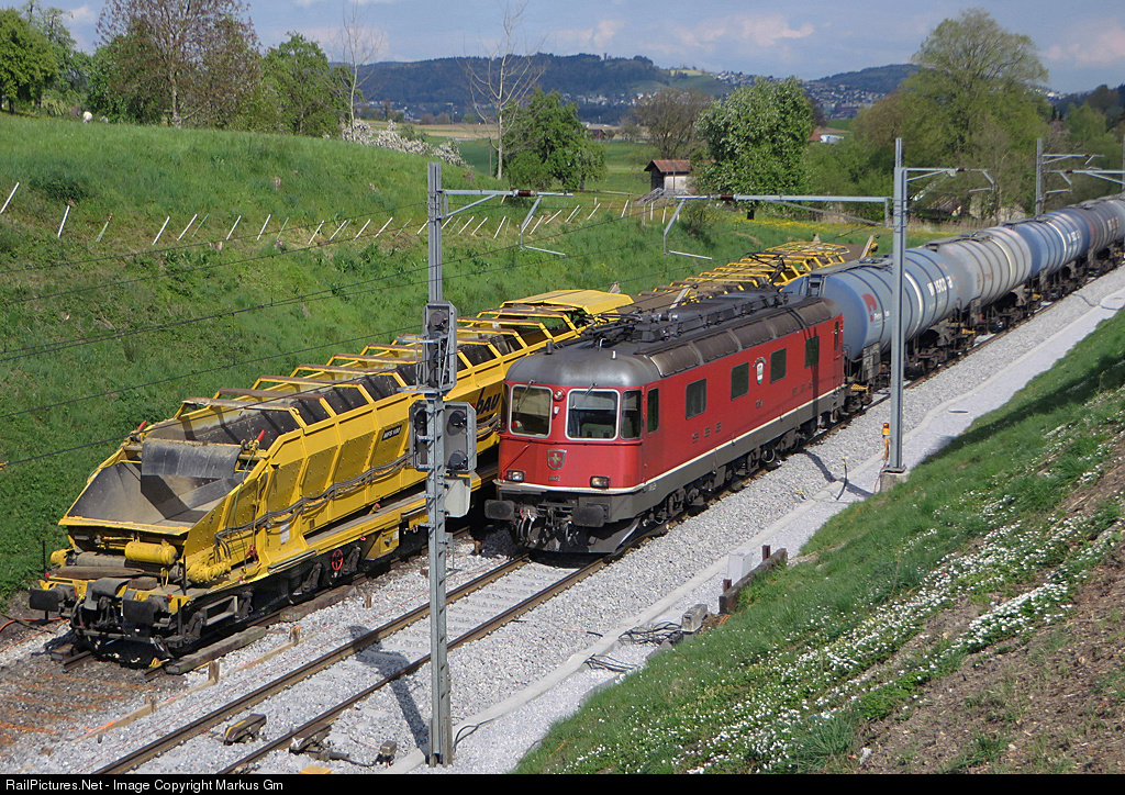 | Train with empty tank cars passes the construction area between Eschlikon and Sirnach. Left you see a special transport car for used gravel. The left track ends just at the bogie |
