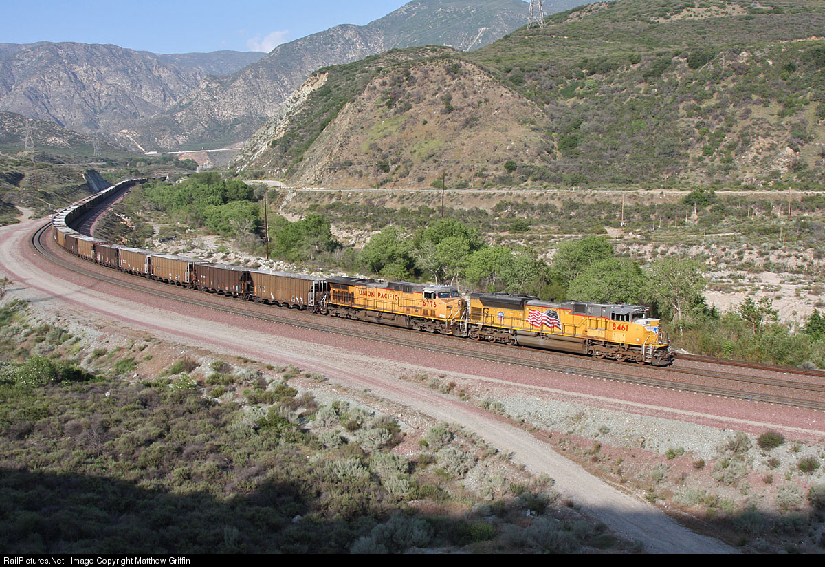 A westbound UP loaded ore train eases down Cajon Pass between Blue Cut and Keenbrook.