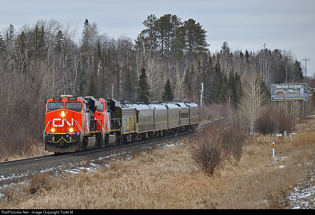 | You call, we haul. Wonder if that's what the crew was thinking when CN ran a business train filled with CN top brass that operated from Winnipeg to Superior on a cold and gloomy Minnesota spring day. Here the train sails along at track speed having just crested the Laurentian Divide. |