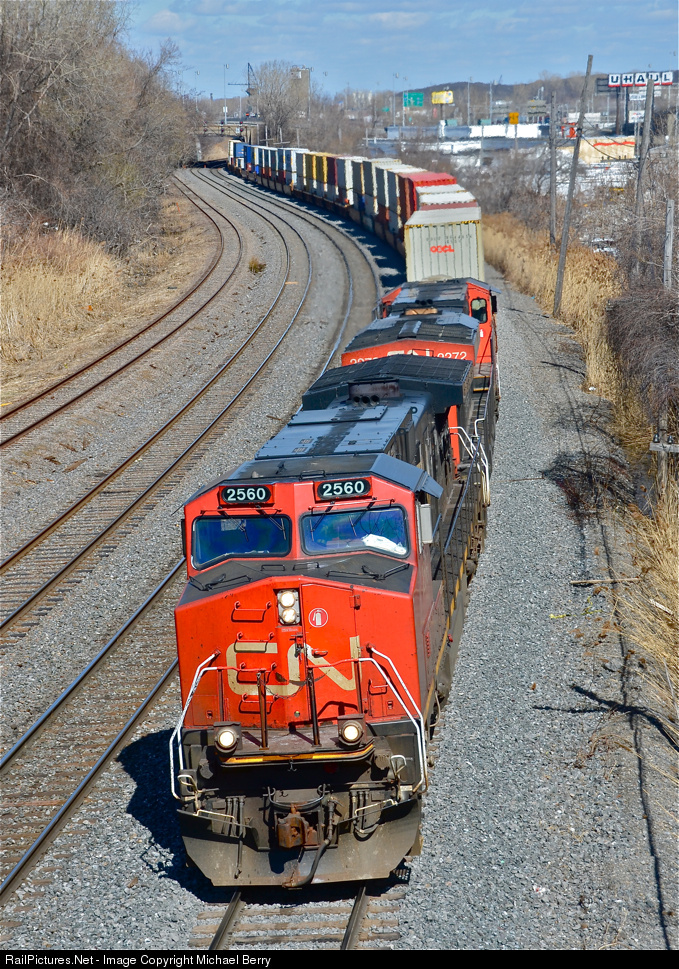 | CN 2560 and CN 2272 head west with the second section of CN 149. This train passed through Montreal West at about 3:00 PM, the first section around 7:15 AM. This train carries a lot more traffic from the Port of Montreal since CN took a contract away from CP. For more train photos, click here. |