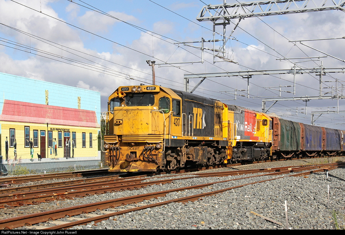 Trains on 3' 6" (1.067m) track from Whangarei to Bluff with virtually heritage rebuilt EMD and GE locomotives still the mainstay power. The network was privatized in 1990's and operated by Toll until 2008 when state owned KiwiRail was established.