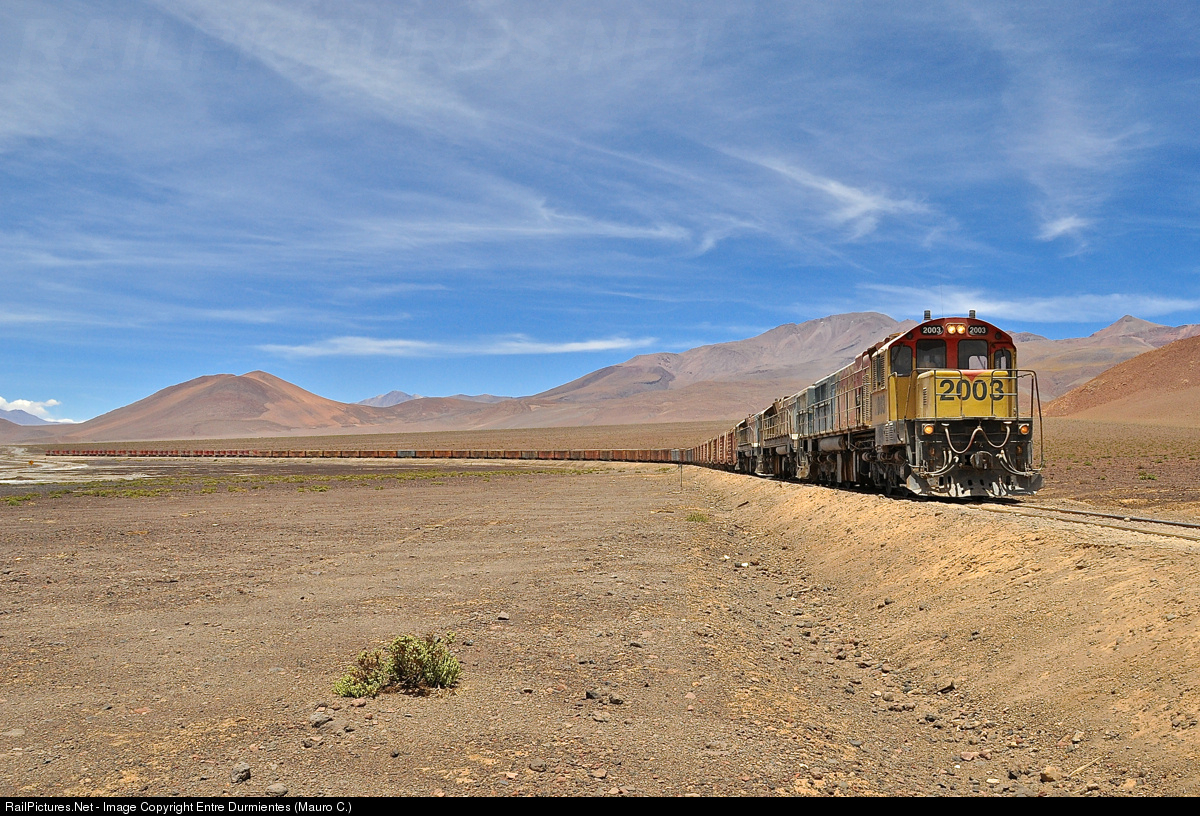 | Triple EMD GL26C-2 traction, northbound FCAB #1251 train Mejillones - Ollagüe with containers carrying ore concentrate and warehouses to the Chile - Bolivia border, bypassing the Ascotan Pass, the highest point on the route to Ollagüe (4000 m). |