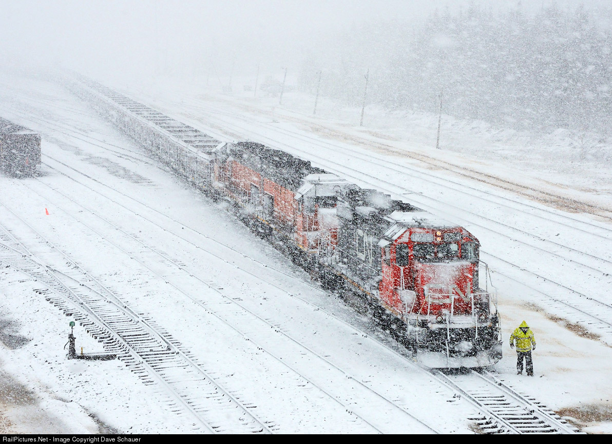 | Wet and heavy snow blowing sideways never makes for a good day to be doing ground work (or trying to keep your lens dry). Here a Proctor Roadswitch arrives with a train of ore empties from Duluth as the conductor braves the elements to throw a switch. |