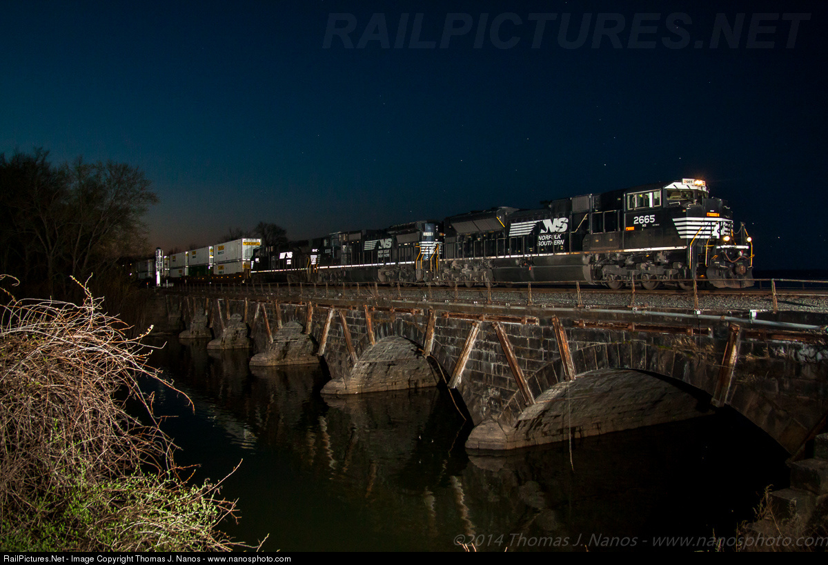 | Norfolk Southern intermodal train 26T rolls over Sherman's Creek in Duncannon, PA just after sunset and as the blue hour continues. |