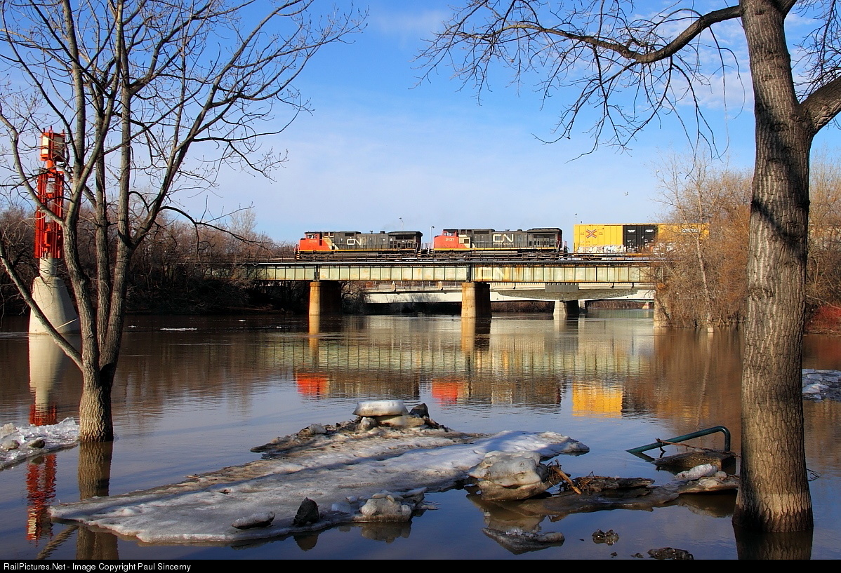 CN 2500 leads a westbound manifest across the Assiniboine River.