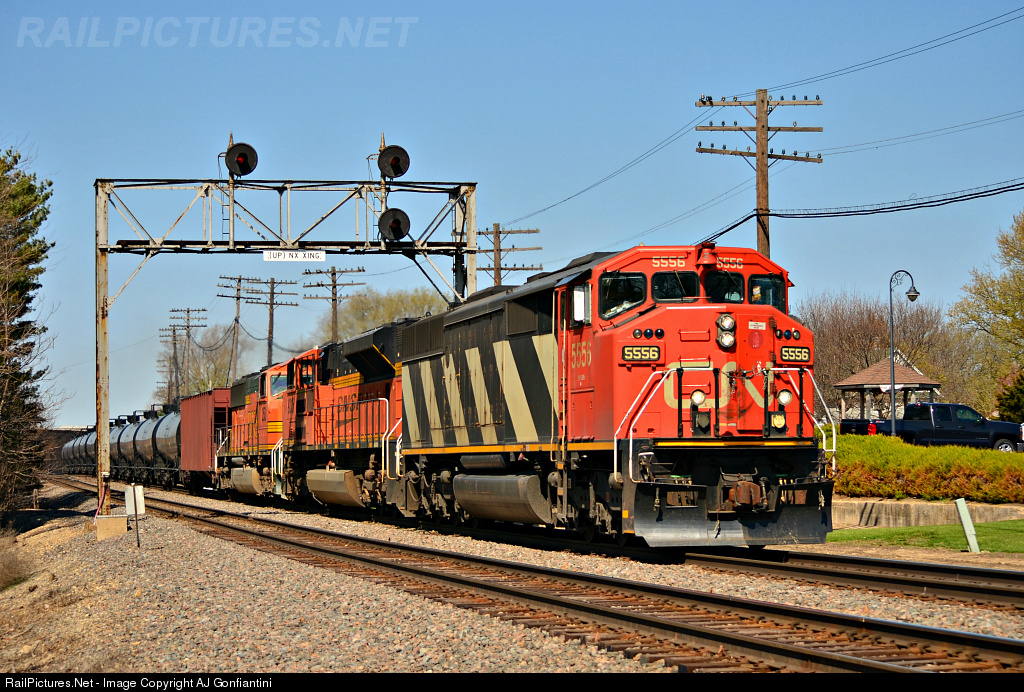 | CN 5556 is on the point of an eastbound oil train, with BNSF 9316 and 253 trailing. This was probably one of the best lash-ups that went through that day. |