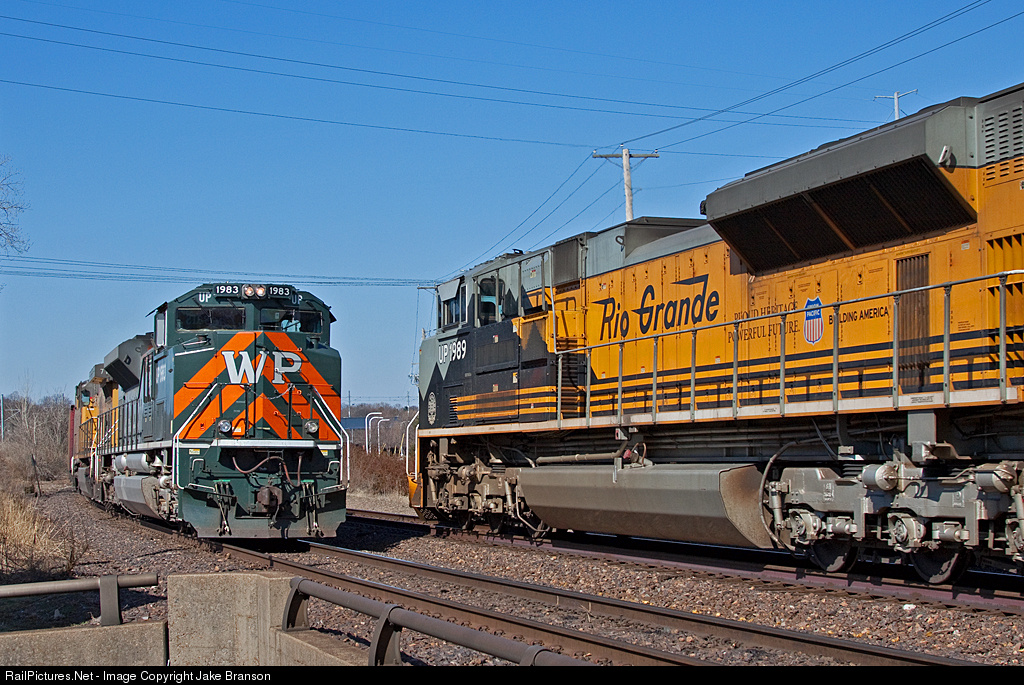 1/3 of UP's heritage fleet congregates at Maplewood, MO, as the Rio Grande unit, serving as the DPU on Dupo, IL, bound intermodal KLBDU 20, meets the WP unit resting on the point of coal train CBTNT 20. In about 20 miles, the DRGW locomotive will arrive at its destination of Dupo.