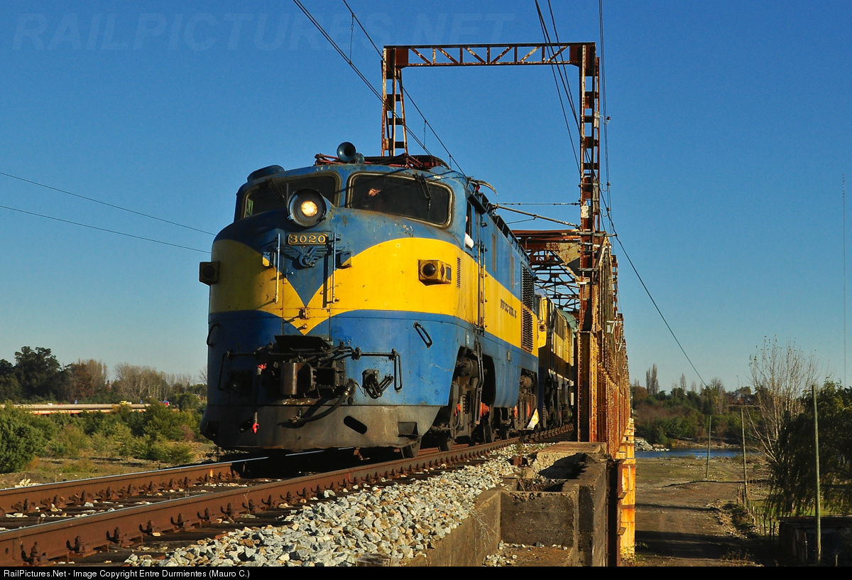 | A E-30 locomotive of italian origin (Gruppo Azziende Italiane), drag a passenger train, special service #22.022 Temuco - Santiago, passes at high speed the railway bridge over the Ñuble river. |