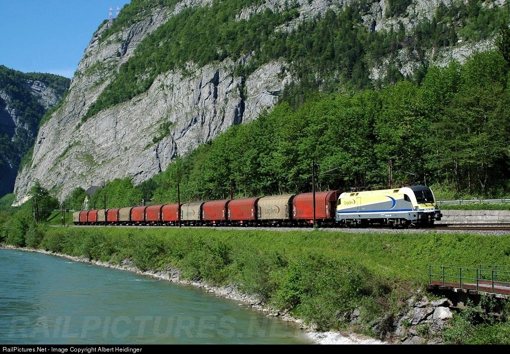 CargoServ operates a coil train from the steel plant at Linz to Cittadella (Italy). Here this train can be seen running along Salzach River through the canyon south of Golling.