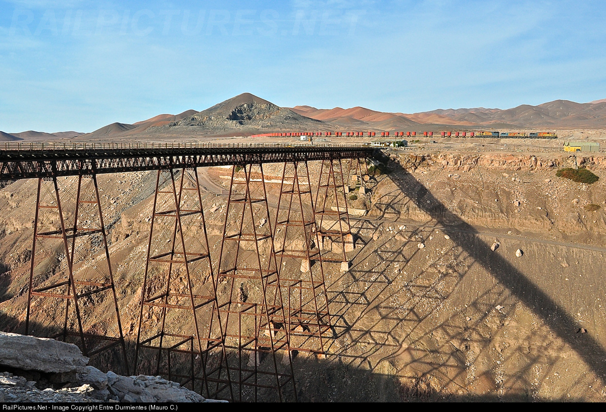 | Old viaduct over the canyon of Loa river (built in 1899, 104 meters high), in Conchi town, and FCAB #209 ore train from Mejillones and a long travel to Ollagüe. |