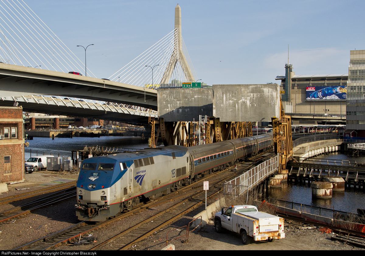 | Amtrak 193 brings up the markers of Downeaster 686 as it shoves the train past the former Boston & Maine Tower A, across the Charles River drawbridge and into North Station. The Zakim Bridge and the TD Garden, which hosted a Bruins vs. Chicago Blackhawks game that night, dominate the background. |