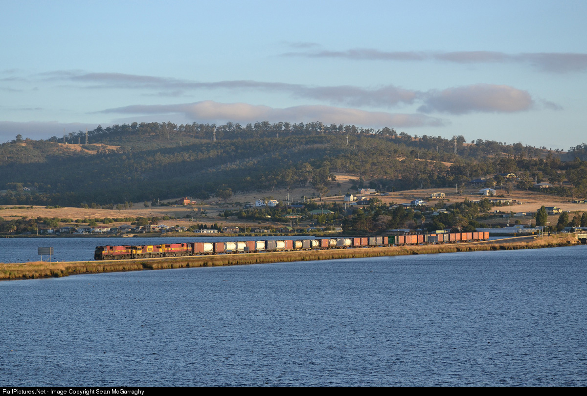 | Crossing over the Derwent River near Granton in Hobart's north, ex WAGR D class 2021 & 2020 sandwich ex Queensland Rail's 2053 with 635 intermodal train from Burnie headed for Hobart. |