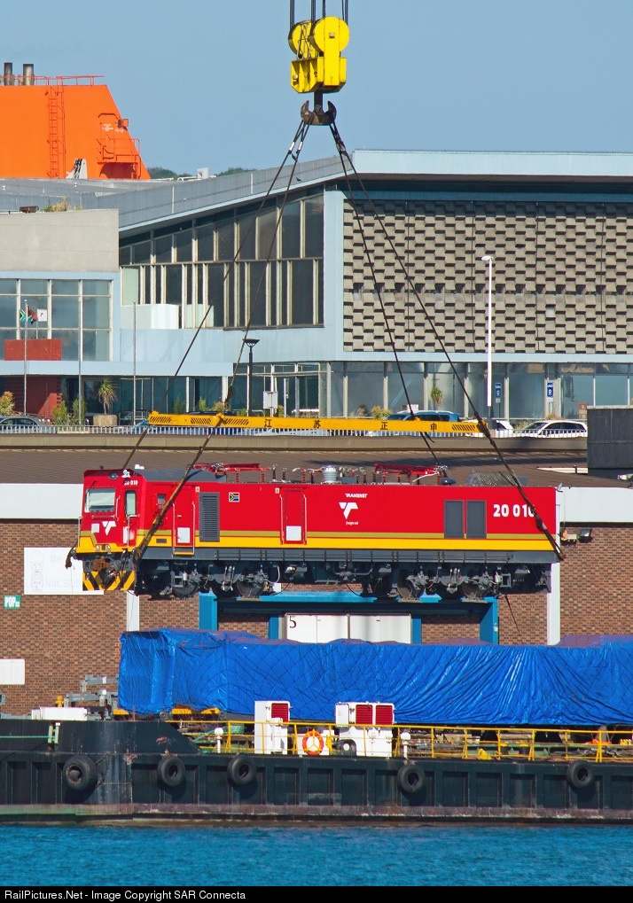 The final fully assembled Class 20E direct from China, 20 010, is about to be craned onto the wharf at O Shed in Durban Harbour via the floating crane "Indlovu". She had just arrived in Durban from China aboard the Oriental Explorer, together with four Class 20E bodies (bubble wrapped in blue), which are visible on the open deck of "Indlovu". The four bodies will be transported by road to Koedespoort. Fellow South African and RailPictures.Net contributor, Col. André Kritzinger, has done the most amazing work on Wikipedia (the free online encylopedia), in respect of a series of articles, where he covers the full technical and introductory details of each and every locomotive Class / Type / Series to have worked in South Africa and I quote from his insertion on the Class 20E. "The first ten of ninety-five 3 kV DC and 25 kV AC dual voltage Class 20E electric locomotives for Transnet Freight Rail were built in China by Zhuzhou Electric Locomotive Co., a subsidiary of the China South Locomotive and Rolling Stock Corporation (CSR), China's leading train manufacturer. The first two of these locomotives, no. 20-002 and 20-003, were landed at Durban Harbour on 14 November 2013. Three more, no. 20-001, 20-004 and 20-005 were landed on 18 December 2013. The contract marked Zhuzhou’s largest single foreign order of electric locomotives to date and made provision for the company to export electric locomotive manufacturing technologies to South Africa to enable a local production ratio of more than 60 percent. The roll-out ceremony of the first locomotive, no. 20-001, took place at the factory in Changsha in central China's Hunan Province on 20 August 2013. The remaining eighty-five locomotives are to be built in South Africa by a consortium composed of CSR Zhuzhou and the South African Black Economic Empowerment company Matsetse Basadi. The Class 20E has regenerative braking, a maximum speed of 100km/h, and is equipped with low-speed controls. The units, with radio frequency distributed power (RFDP) technology, will be able to work mid-train in lengthy wagon consists. Following testing, the ten Chinese-built lococomotives are expected to enter service in March 2014. The Class 20E is destined for the ore line between Sishen and Port Elizabeth.”