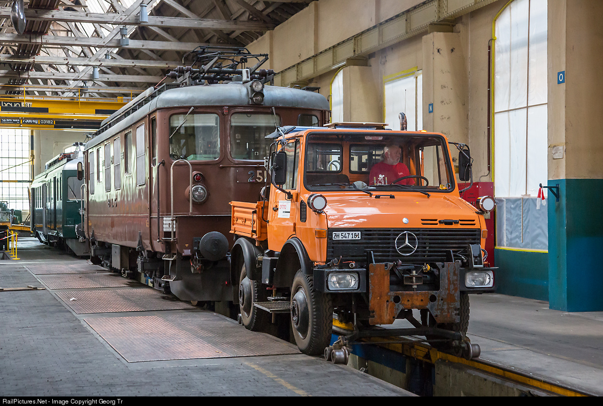BLS locomotive Ae 4/4 # 251, now operated by association Extrazug.ch in Langnau and based in Burgdorf, is shoved by a road/track Unimog vehicle into the hall 1012 of the former SLM (Swiss Locomotive and Machine Works) on the occasion of the exhibition celebrating 750 years town privilege of Winterthur. In the background electric railcar BFe 4/4 # 1643 of SBB Historic.