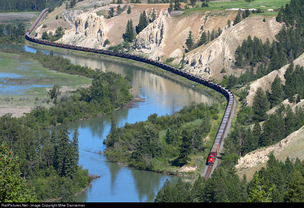 A southbound Canadian Pacific empty coal train curves along the Columbia River below the bluffs of Radium Hot Springs, British Columbia, on July 24, 2011.