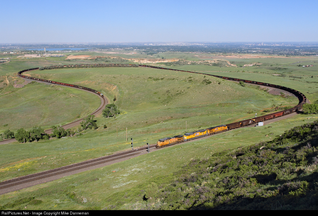 A westbound Union Pacific coal empty wraps itself around Big 10 Curve as it passes the east switch at Eisele, Colorado, on the long climb to the Moffat Tunnel on the nice clear afternoon of June 9, 2013.