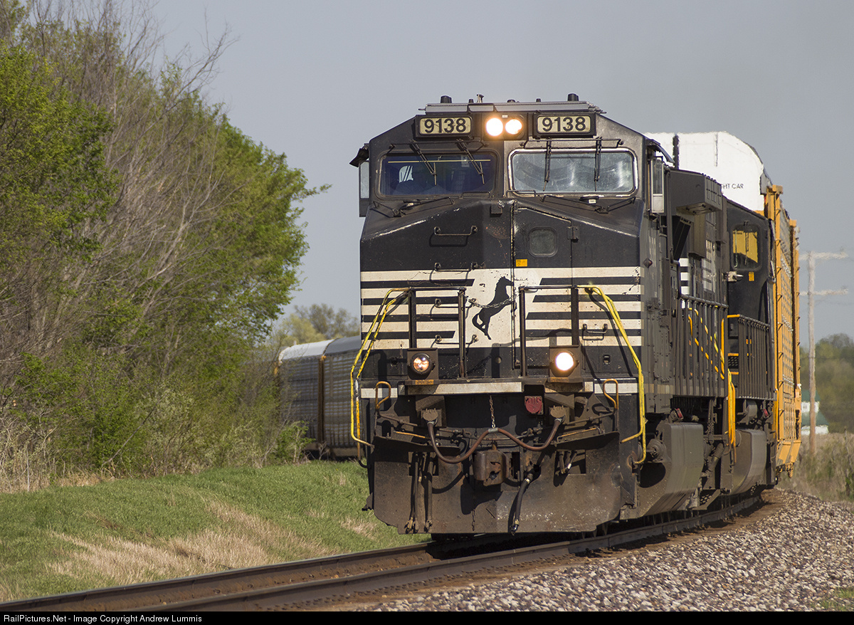 | With the weather warming up and trees getting green back on them,shots like these are possible.Here we see Norfolk Southern 9138 leading a auto-rack train destine for Kansas City,MO. |