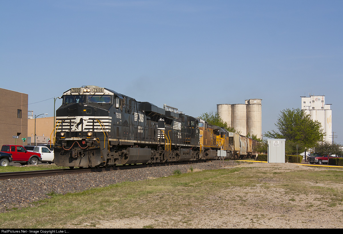 | Slowly rolling through a slow order in downtown Hays, NS 7606 and another NS unit are in charge of the twice weekly Salina to Denver manifest. |