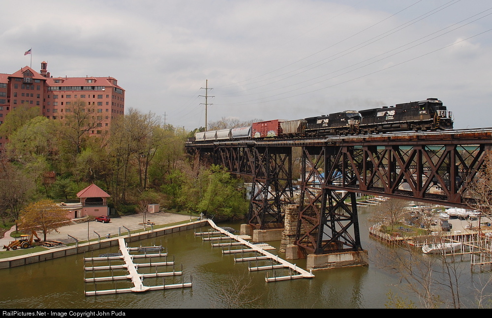| NS 310 heads over Rock River trestle as it continues on it's trip east to Buffalo. After the Conrail merger, the bulk of the NS traffic out of Bellevue would take the connection to the Chicago Line at Vermilion. Thus traffic levels on this section of the line dwindled to just a couple of trains a day. Having a morning eastbound is pretty rare. |